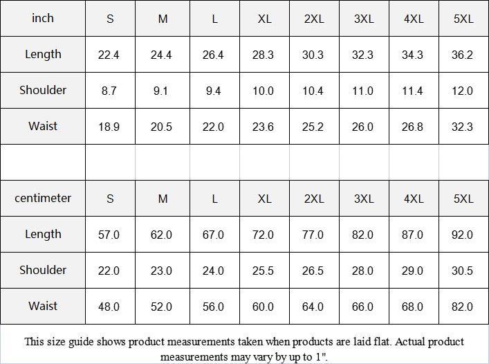 | inch | S | M | L | XL | 2XL | 3XL | 4XL | 5XL |