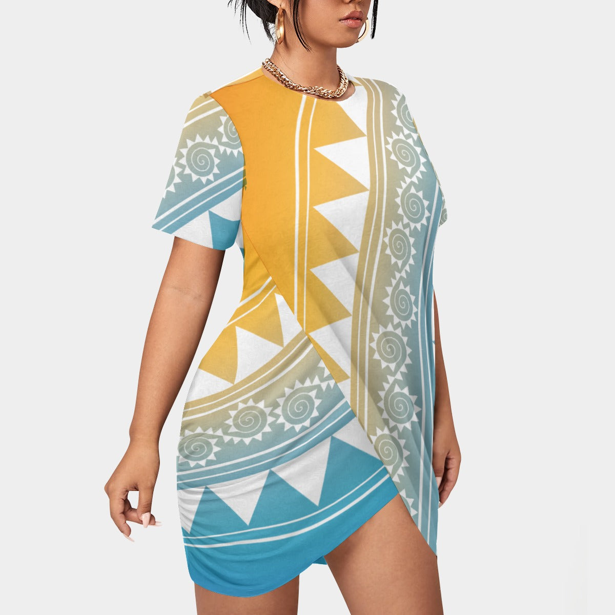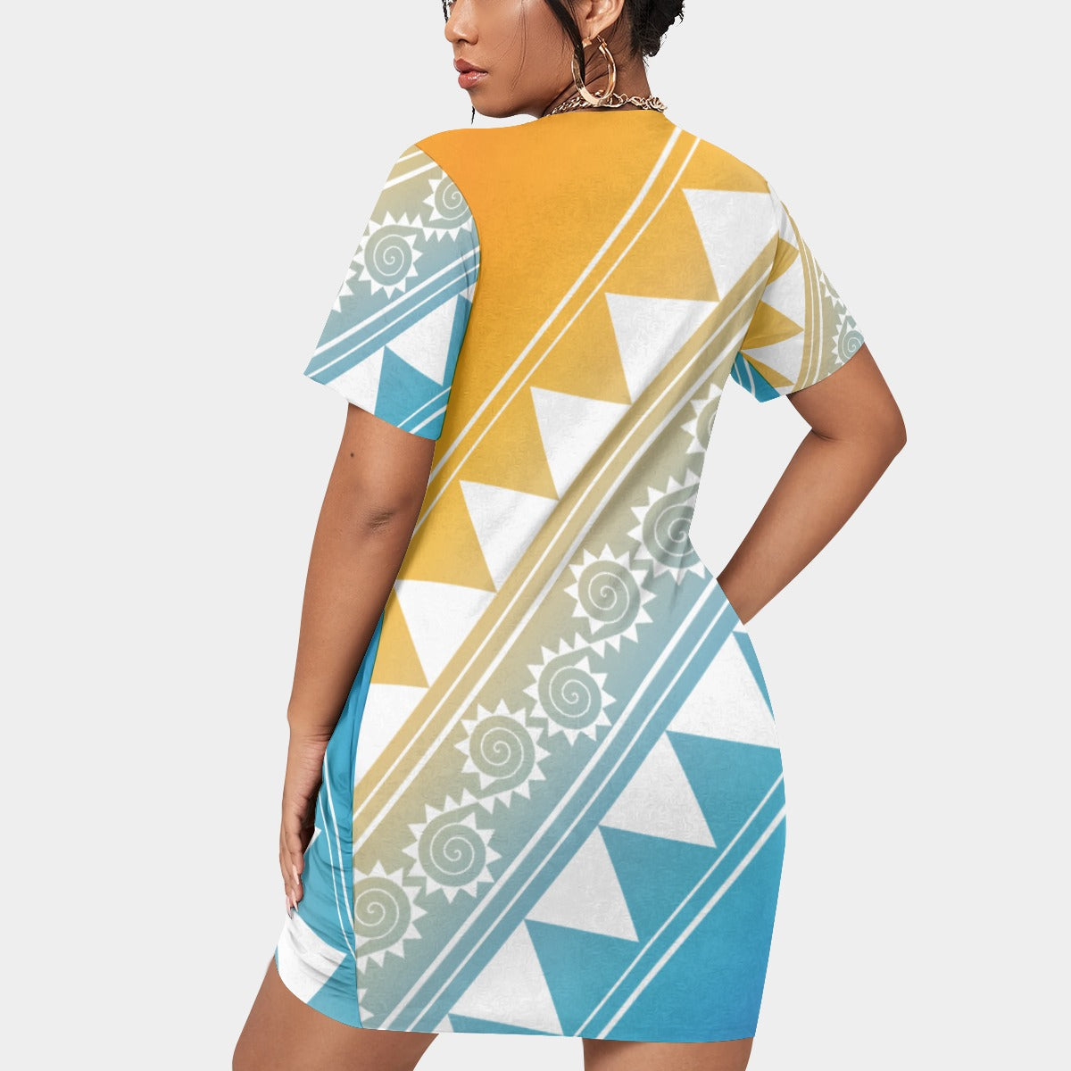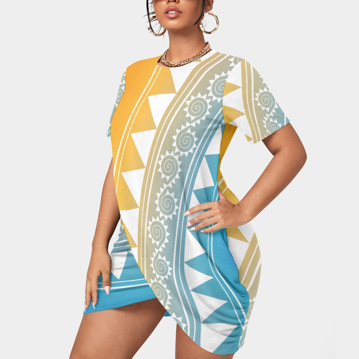 All-Over Print Stacked Hem Dress With Short Sleeve(Plus Size)