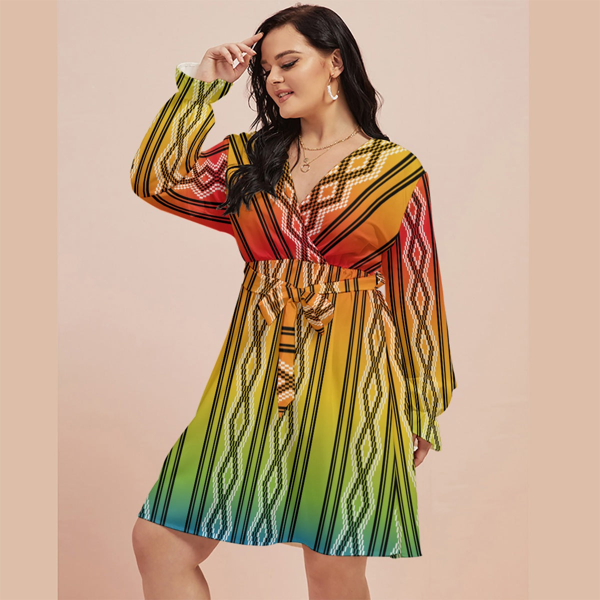 Rainbow Basket | V-neck Dress With Waistband(Plus Size)