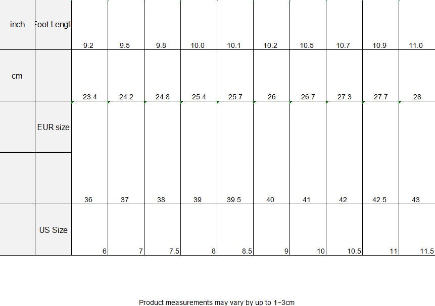 | US Size | 6 | 7 | 7.5 | 8 | 8.5 | 9 | 10 | 10.5 | 11 | 11.5 | |